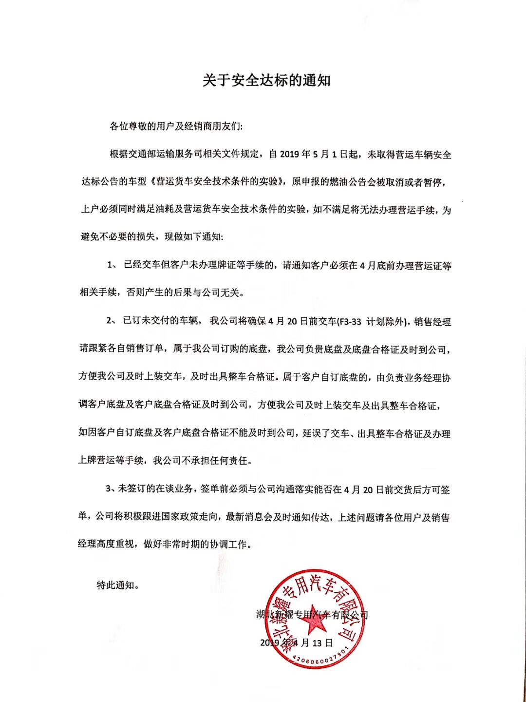 危貨車緊急通知:關(guān)于安全達(dá)標(biāo)的通知