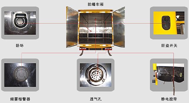 湖北新耀煙花爆竹運(yùn)輸車廂體 :為雙層金屬骨架結(jié)構(gòu),外部為冷扎鋼板,內(nèi)壁采用鋁合金板蒙面,夾層為隔熱阻燃材料填充。設(shè)置對(duì)開門,如需安裝抗暴容器則增開側(cè)門,側(cè)壁設(shè)有防雨功能自然通風(fēng)窗口,底部鋪有阻燃導(dǎo)靜電膠板,保證安全。廂體內(nèi)部前面和側(cè)面裝有固定拉環(huán),與捆綁帶使用捆綁貨物以避免移動(dòng)。