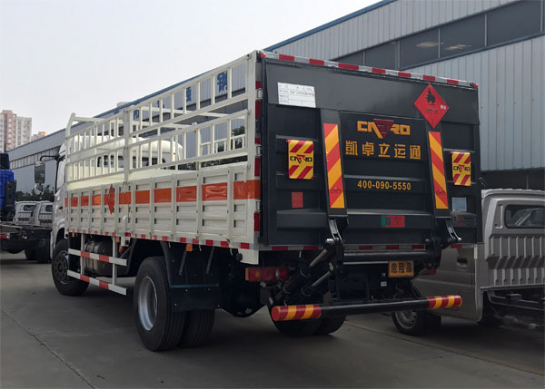 2、廂體為欄板或倉欄式結構,廂體底部與廂內前部鋪有阻燃導靜電膠板,并與底盤等電位連接,通過車輛后端的導靜電裝置與大地相連,可防止靜電火花的產生和車輛靜電及時釋放,提高易燃液體運輸車的安全性。廂體內部前面和側面裝有固定拉環,與捆綁帶使用捆綁貨物以避免移動,保證安全。