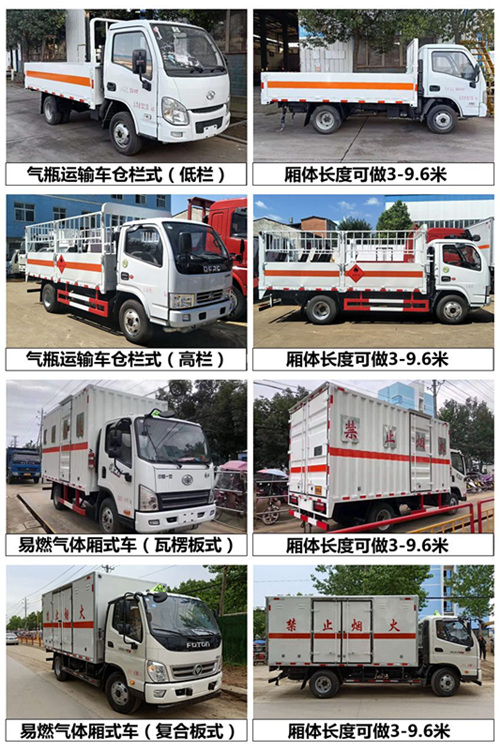 易燃氣體廂式運輸車是針對煤氣企業、石油液化企業的氣鋼瓶運輸而開發的專用車。內附捆扎帶、防撞條、防靜電等設施。廣泛用于液化石油行業、易燃易爆行業、市內短途 配送,安全可靠,方便快捷。目前氣瓶運輸車噸位從0.7噸到9噸,產品品牌有:福田、江淮、江鈴、慶鈴、東風五大系列,30幾種車型,可以滿足不同用戶不同噸位的需求.氣瓶運輸車,顧名思義,當然是拉液化氣瓶的專用車。又名氣瓶車,液化氣運輸車,易燃氣體廂式運輸車,易燃液體廂式運輸車等多種稱謂。