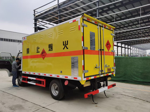 江鈴黃牌寬體炸藥運輸車上戶3噸,國六新排,節油環保,廂體為雙層金屬骨架結構,外部為冷扎鋼板,內壁采用鋁合金板蒙面,夾層為隔熱阻燃材料填充。設置對開門,如需安裝抗暴容器則增開側門,側壁設有防雨功能自然通風窗口,以使廂內外空氣流動,廂體內部做防靜電處理,廂體底部與廂內前部鋪有阻燃導靜電膠板,并與底盤等電位連接,通過車輛后端的導靜電裝置與大地相連,可防止靜電火花的產生和車輛靜電及時釋放,提高車輛的安全性。廂體內部前面和側面裝有固定拉環,與捆綁帶使用捆綁貨物以避免移動,保證安全。