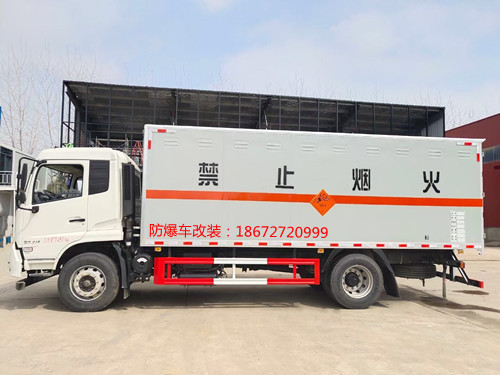 防爆車車門根據客戶要求改裝:后雙開門、可選裝側開門,貨廂前、后各兩個示廓燈、貨廂內安裝離子感煙火災探測器、側廂及前廂內安裝固定臥環、地板及前板裝置防靜電膠皮、側廂開通風口、前廂板安裝滅火器、排氣管尾端安裝排氣火花熄滅器、車架安裝導靜電橡膠拖地帶、駕駛室安裝危險標志燈、門上安裝防盜、車身側面及后部粘貼橙色反光標識、橙色爆字、爆炸品菱形標示、車體后部設置安全告示、危險標志牌、后杠安裝緩沖加強橡膠塊、側后護欄。