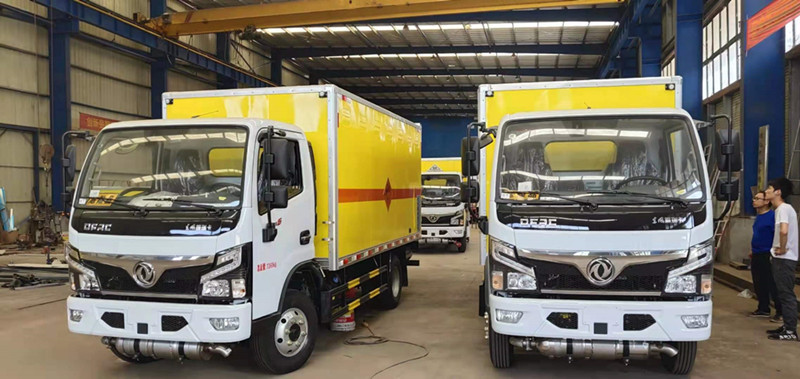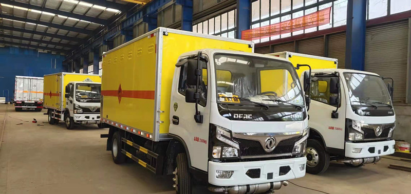 爆破器材運(yùn)輸車廂體外板采用可產(chǎn)生靜電屏蔽效應(yīng)的冷扎鋼板,內(nèi)飾鋁合金,經(jīng)現(xiàn)代工藝復(fù)合而成,廂內(nèi)安裝防燃離子感煙火災(zāi)探測器,前置防撞防靜電膠皮,側(cè)廂安裝固定運(yùn)載物的臥環(huán),側(cè)廂開有通風(fēng)口,前廂板裝有2只滅火器,排氣管前置尾端安裝排氣火花熄滅器(防火罩),車架安裝導(dǎo)靜電橡膠拖地靜電帶2條,駕駛室安裝危險(xiǎn)標(biāo)志燈,身側(cè)面及后部粘貼橙色反光標(biāo)識,1類爆炸品菱形標(biāo)識,車體后部設(shè)置安全告示,車箱體兩側(cè)貼"嚴(yán)禁煙火", 門上安裝防盜報(bào)警器。箱體顏色可選。